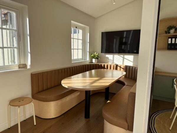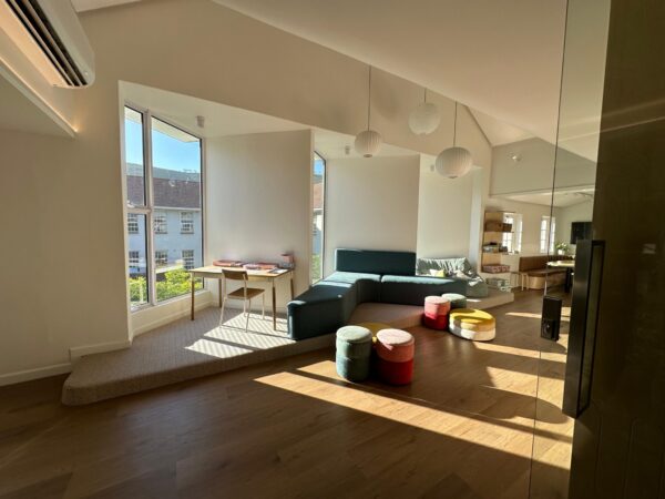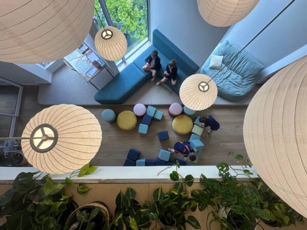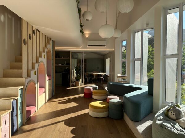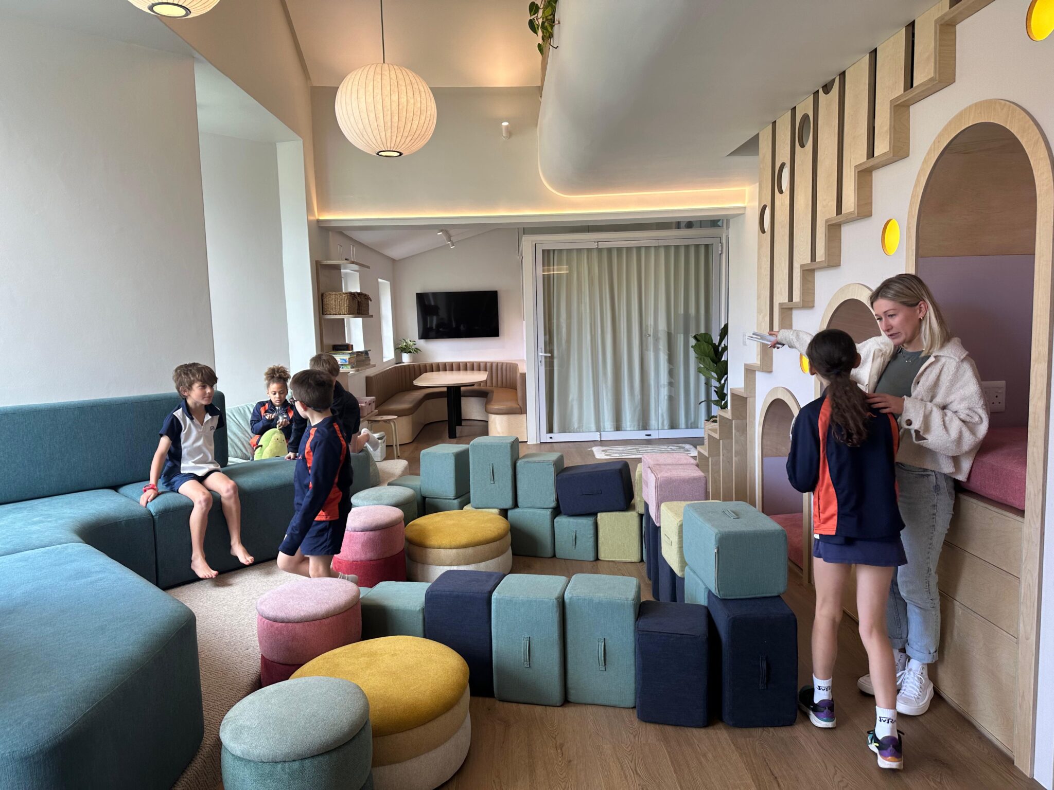 It was crucial for the space to feel welcoming and safe and the double volume of the ceiling allows a feeling of space. A colour palette of calming neutrals and peaceful pastels were combined to support the playful serenity of the space, with each texture used being carefully considered.