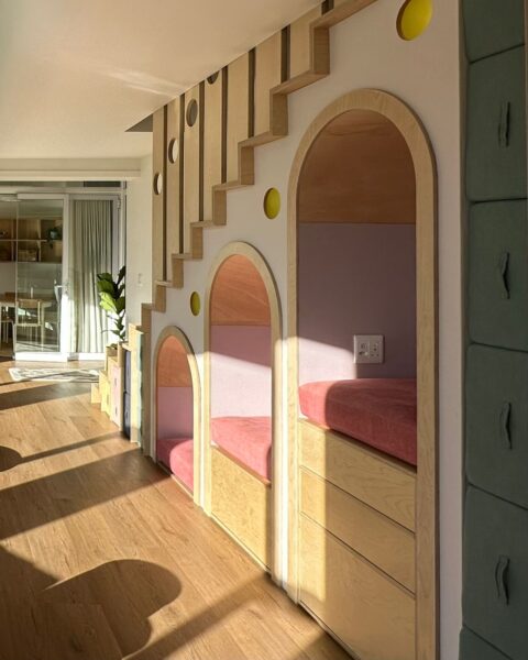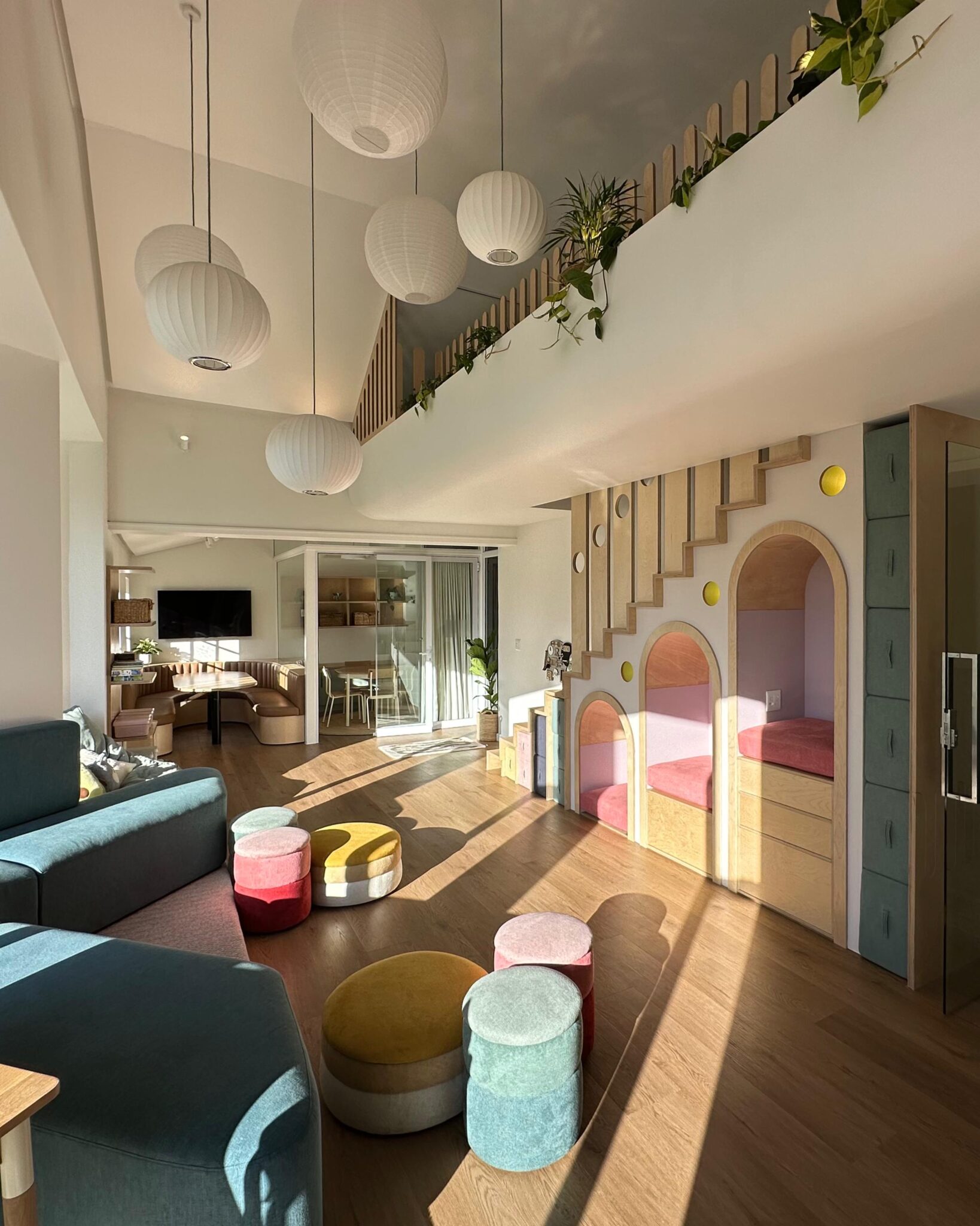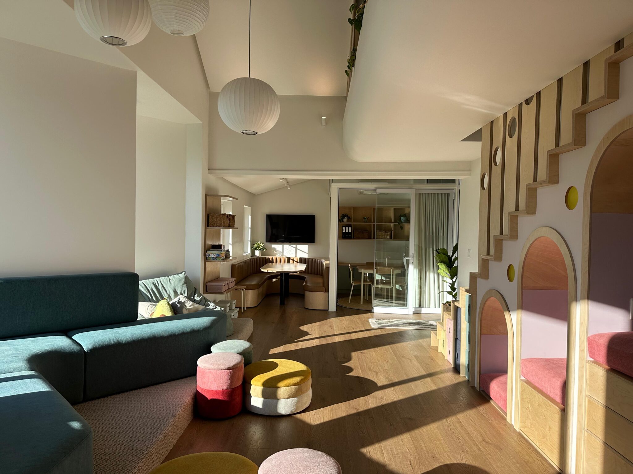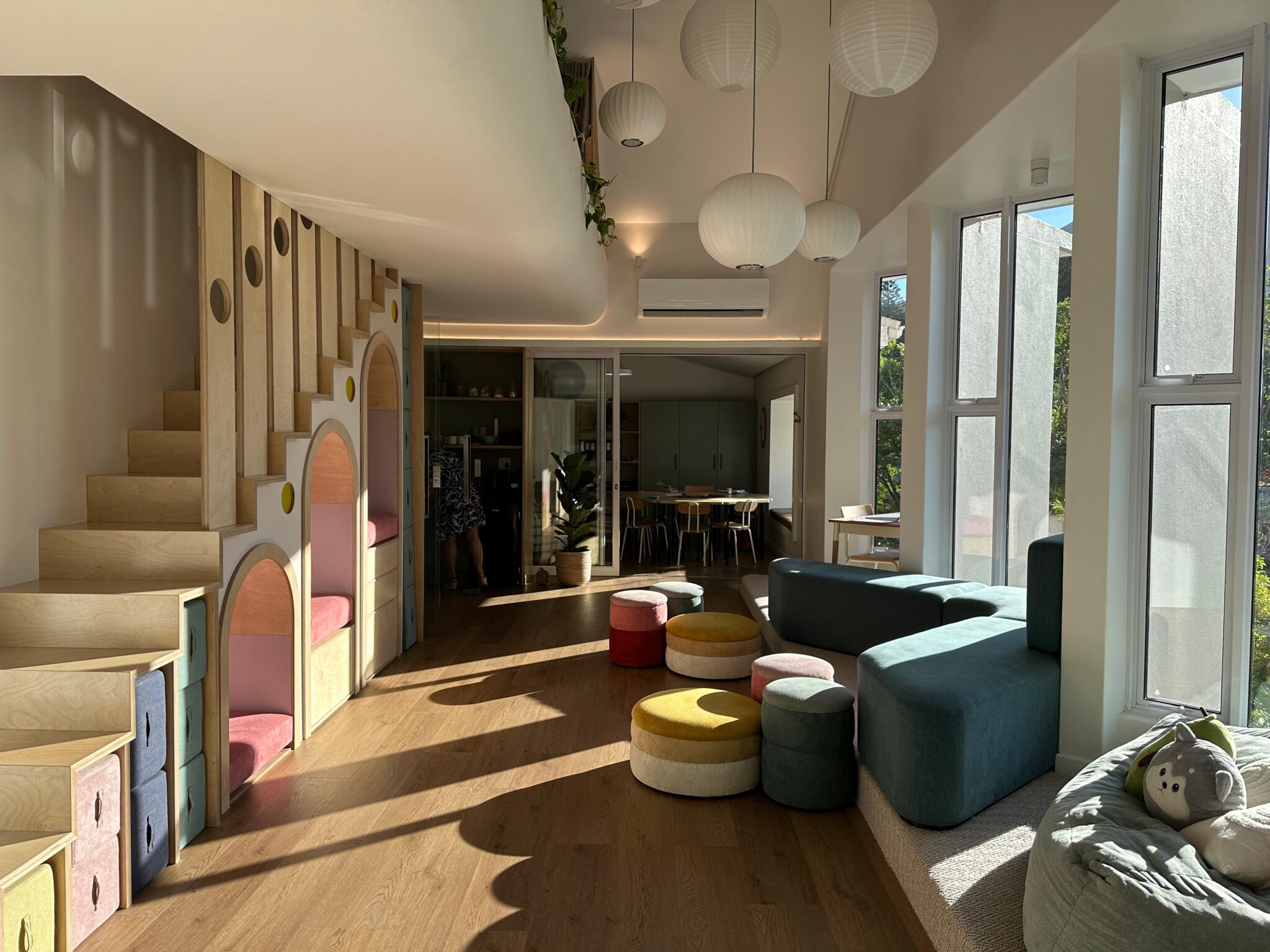 Due to the space being quite contained, everything had to have multi purposes. The furniture was designed to be able to move around and suit both individual and group needs. Spaces can open and close and the staircase doubles as a hiding spot with both storage and cute little alcoves to nap and escape from the exterior world for a while.